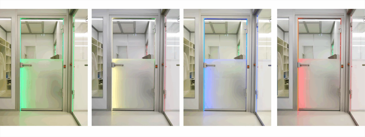 Để đảm bảo rằng nhân viên và khách bên ngoài hiểu ngay họ được phép sử dụng cửa nào và khi nào, hệ thống điều khiển cửa cho khóa khí phòng sạch của chúng tôi sử dụng hệ thống tín hiệu màu: